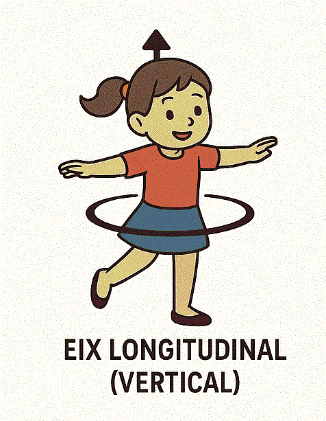 El cos gira al voltant del seu eix vertical (cap-peus), realitzant un moviment en el pla transversal (horitzontal).