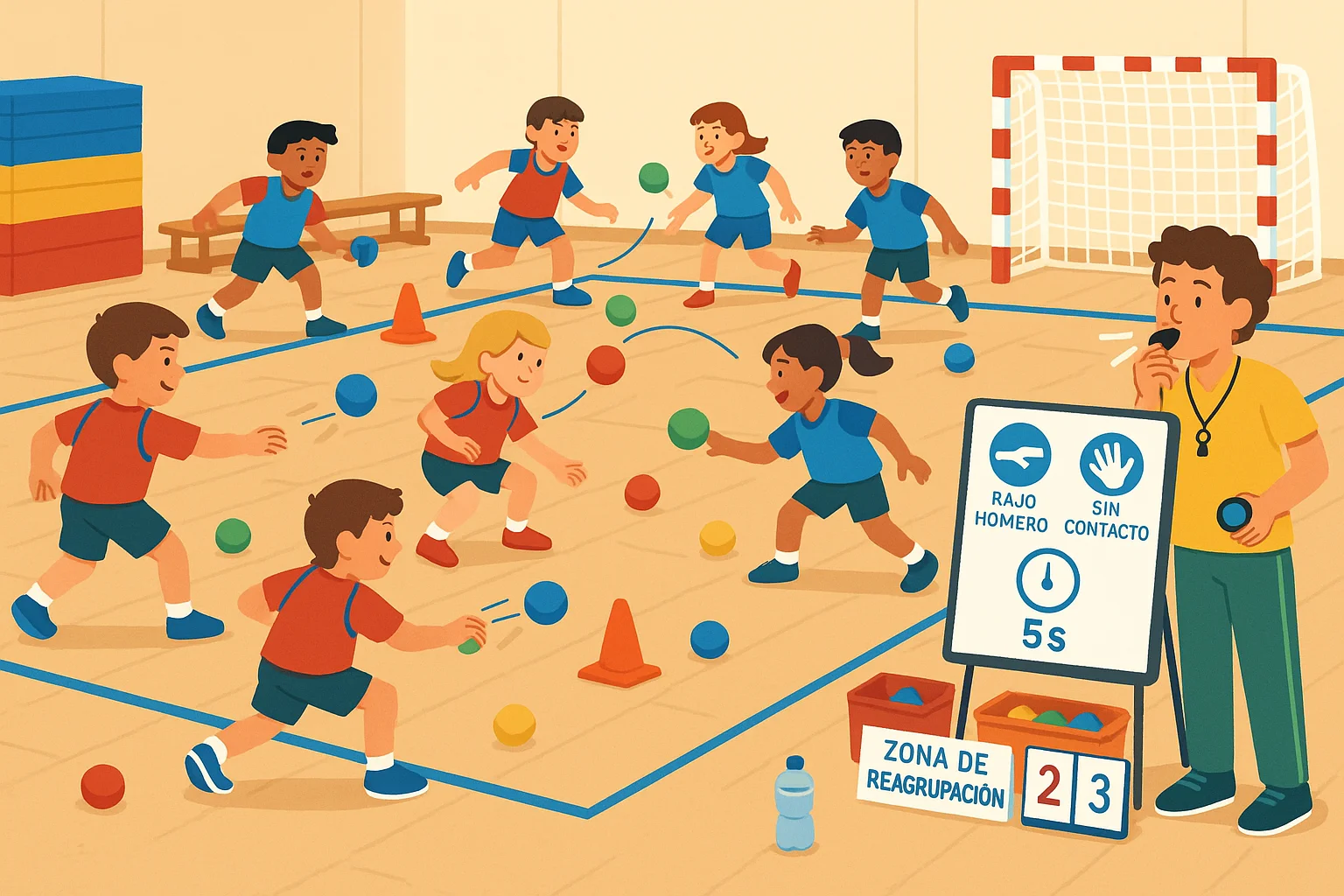 • Progressió tècnica (6–8 min): punteria a cons grans — petits, esquiva per senyals, recepció amb mans toves.