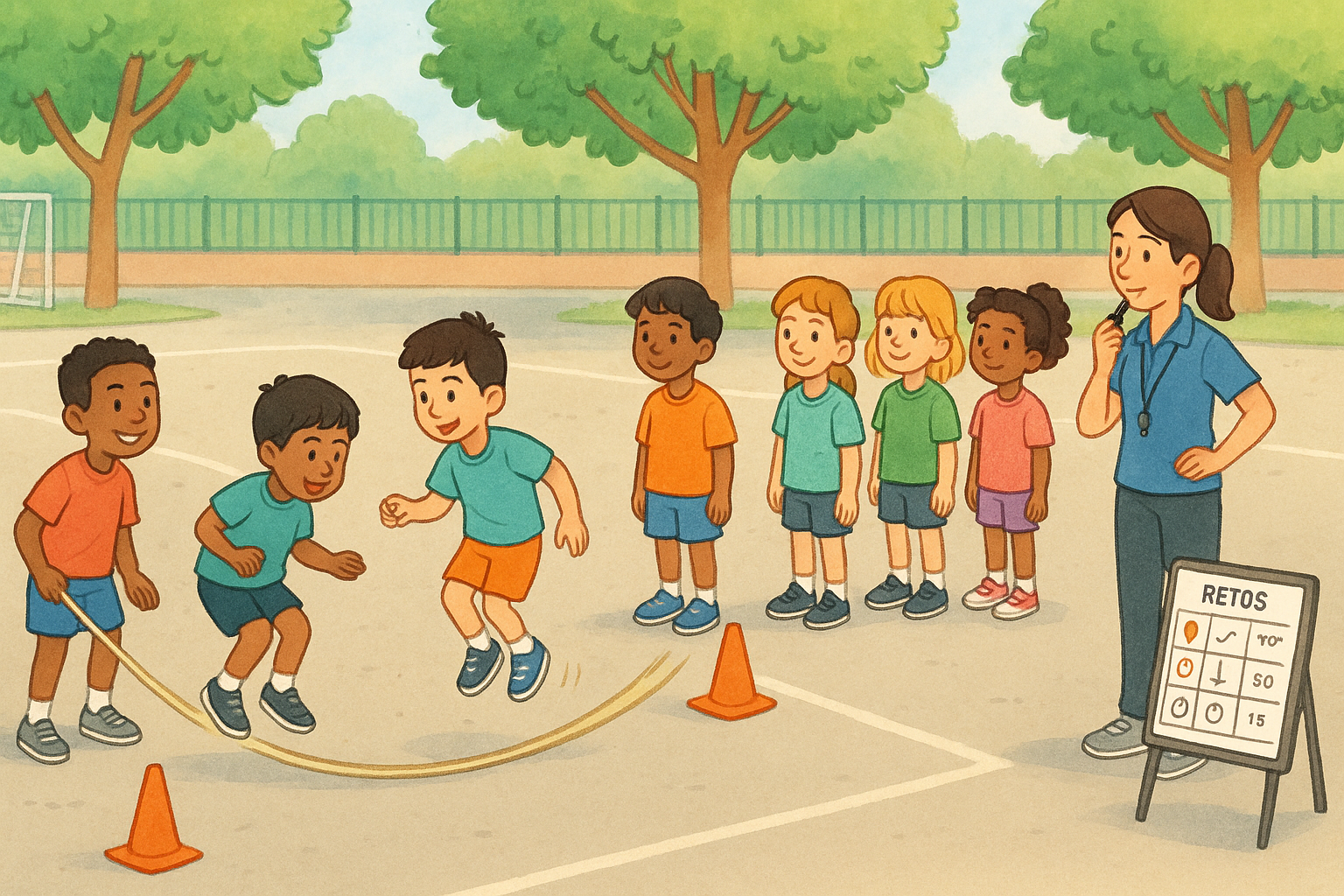 En passar la barca és un joc clàssic de corda ideal per a les classes d’Educació Física a Primària. La seva dinàmica combina ritme, coordinació i cooperació, afavorint la participació de tot el grup.