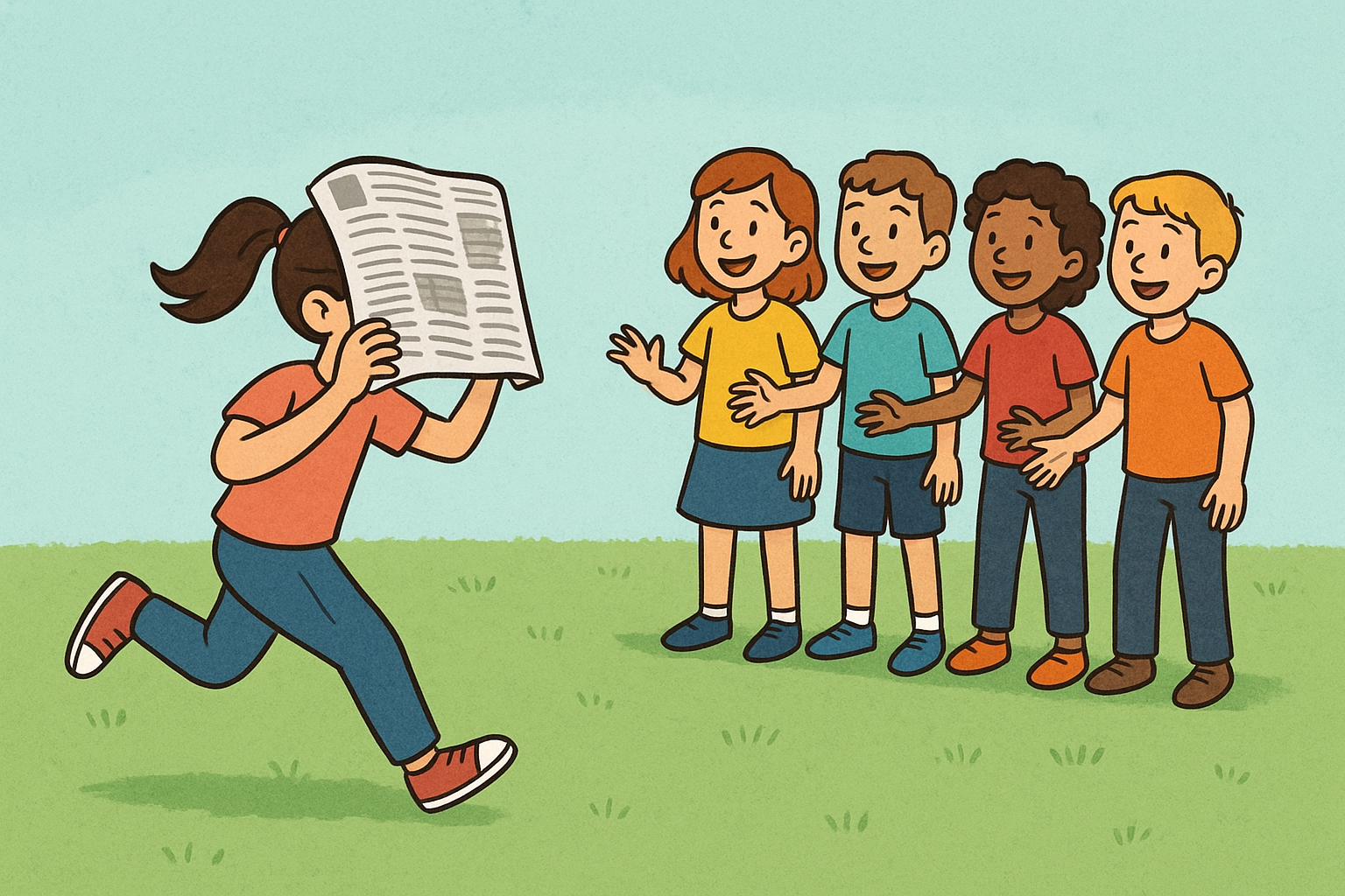 - Inici de l’activitat: L’infant que està separat es col·loca el full de diari a la cara, tapant-se la visió, i ha de córrer cap al grup sense tocar el full amb les mans ni deixar-lo caure.