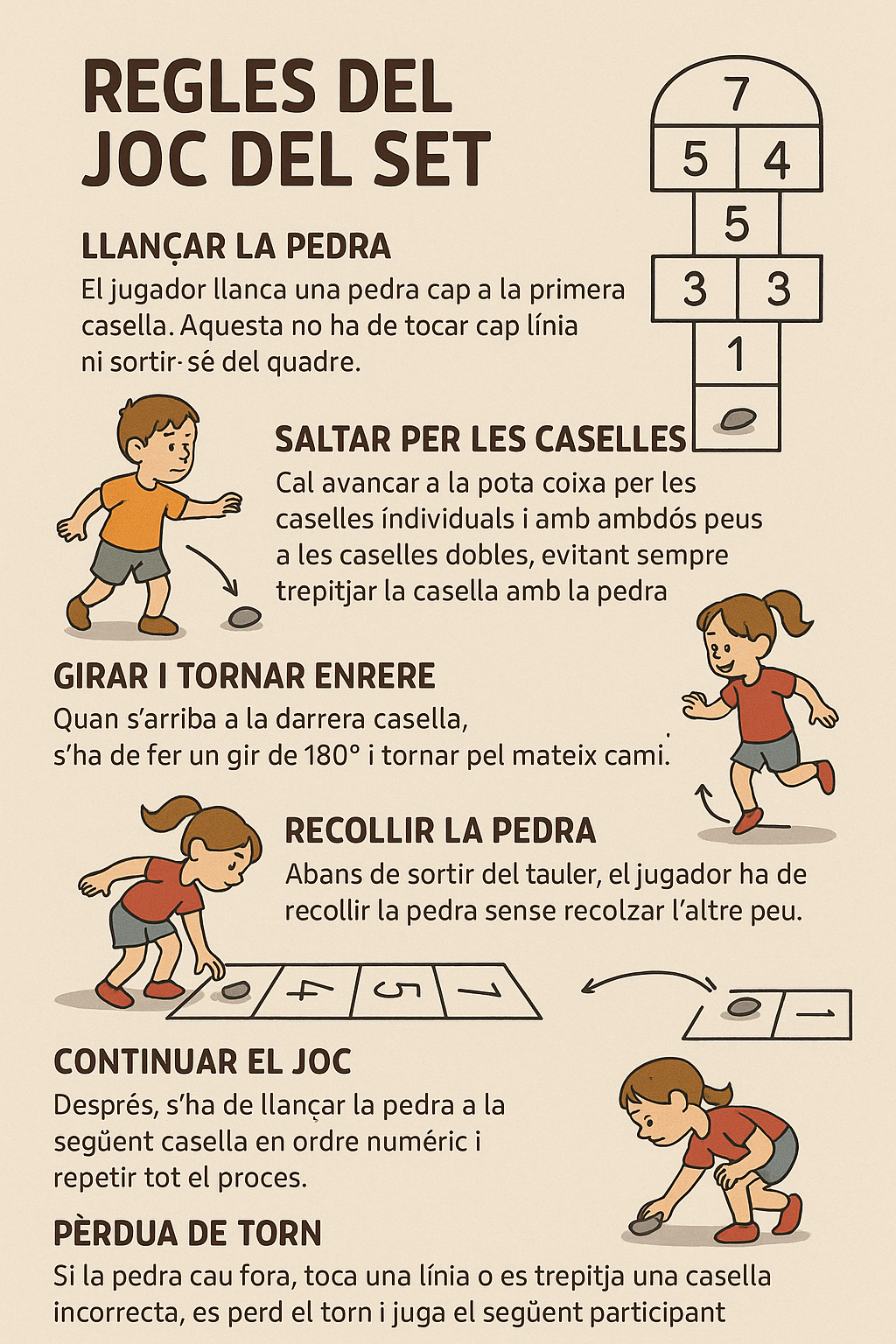 El Joc del Set és un joc tradicional ideal per a infants, que posa a prova la precisió, l’equilibri i la coordinació motriu. Tot i que s’assembla al conegut Joc de l’Avió, el Joc del Set presenta una distribució diferent del tauler i una norma especial que el fa més emocionant i desafiador.