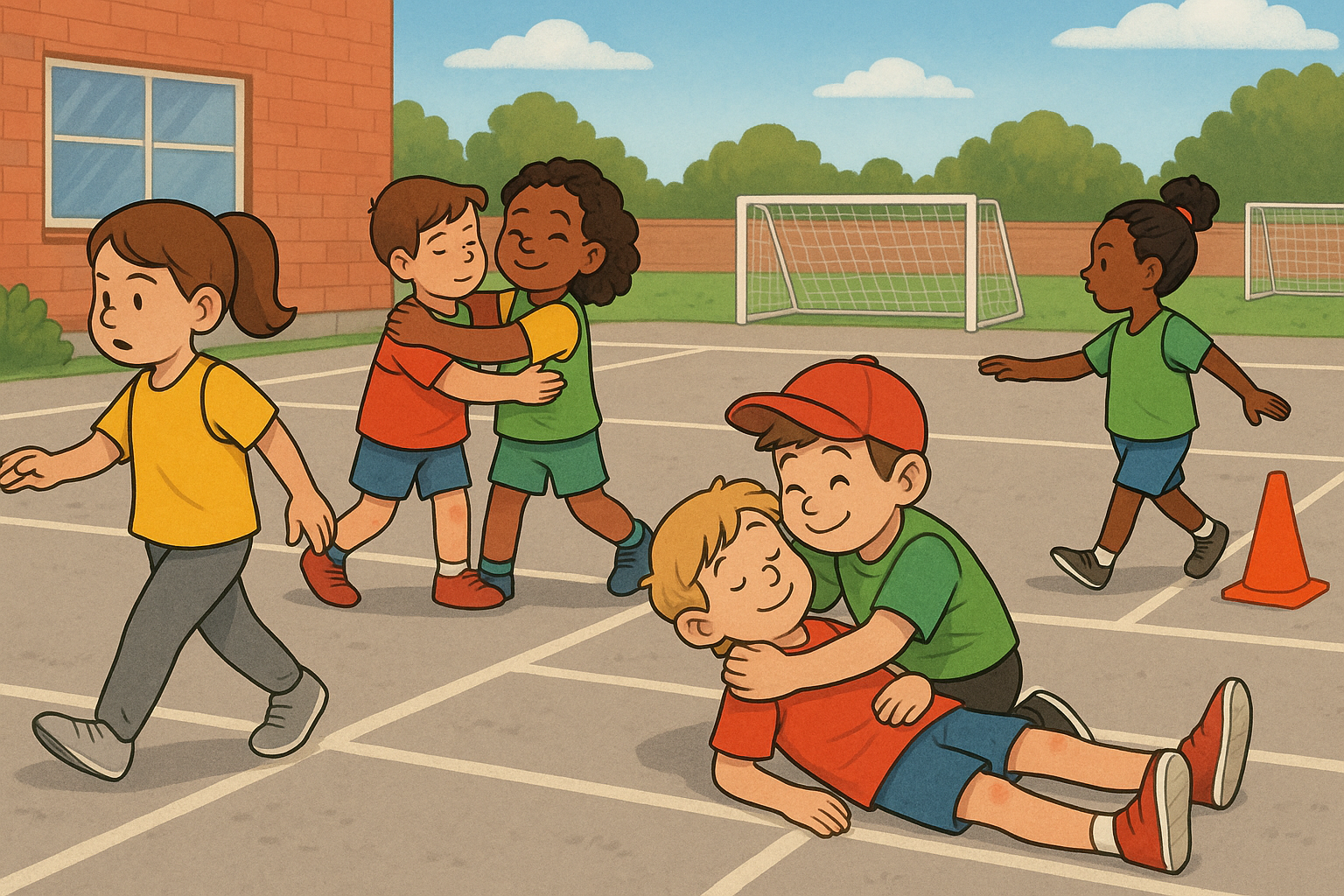 Nens i nenes jugant al joc dels Robots al patí de l’escola.