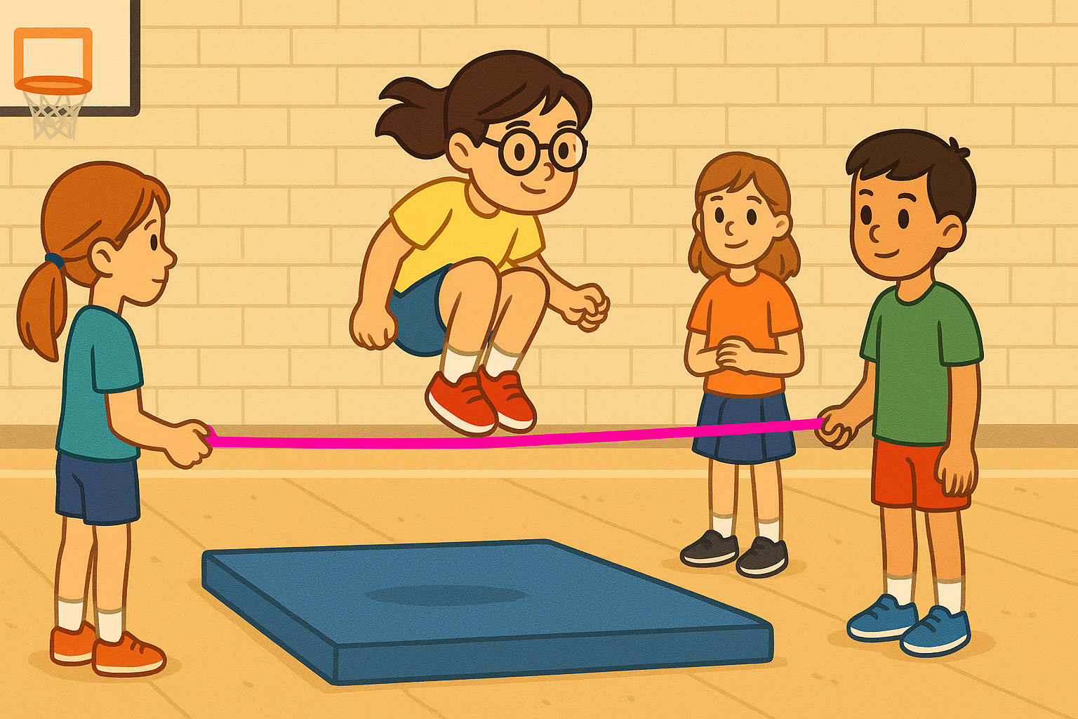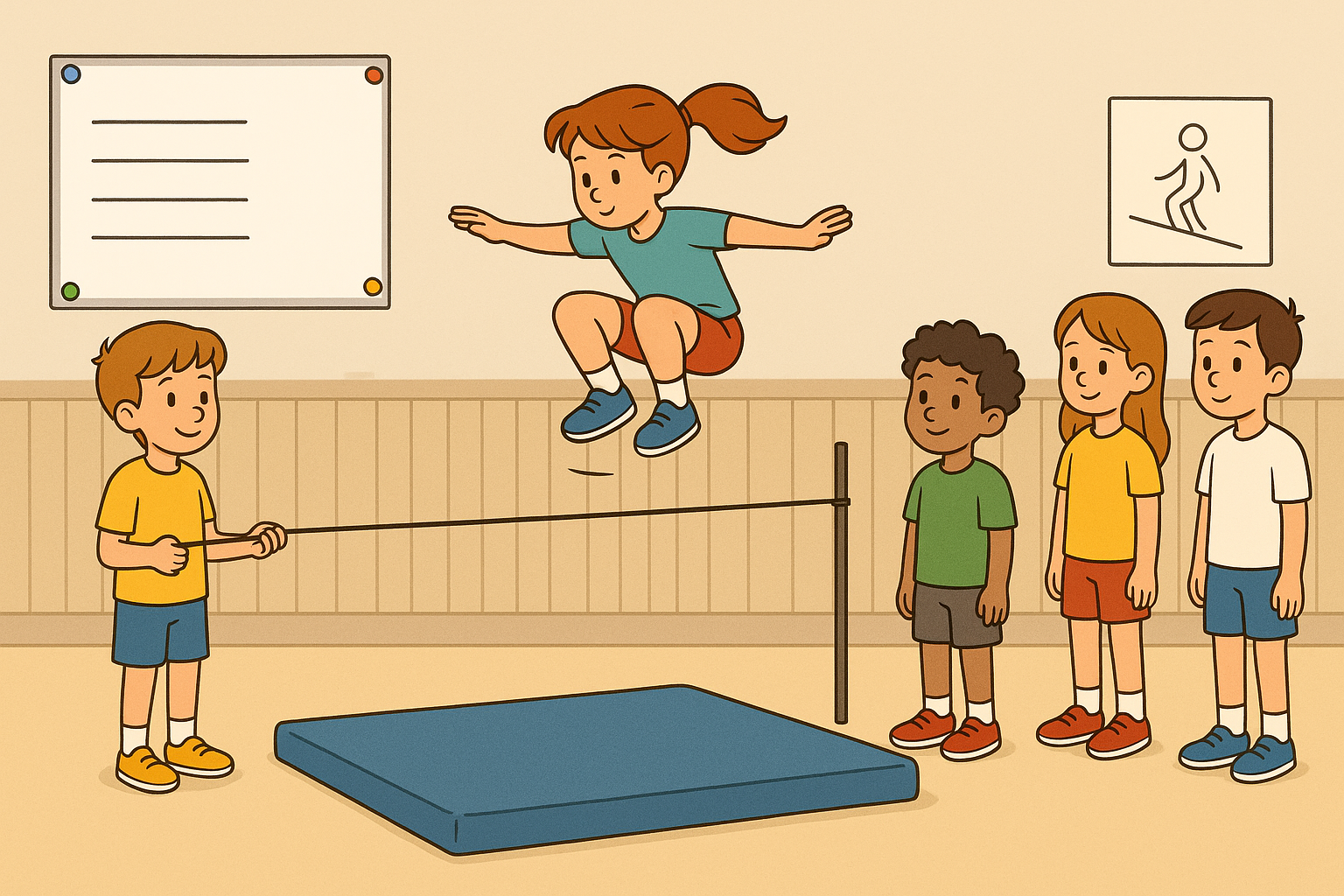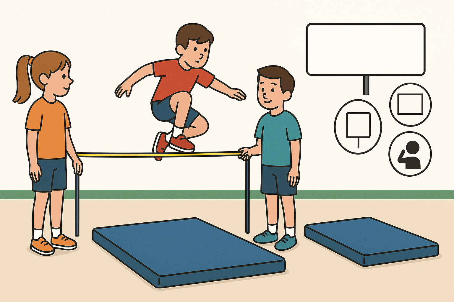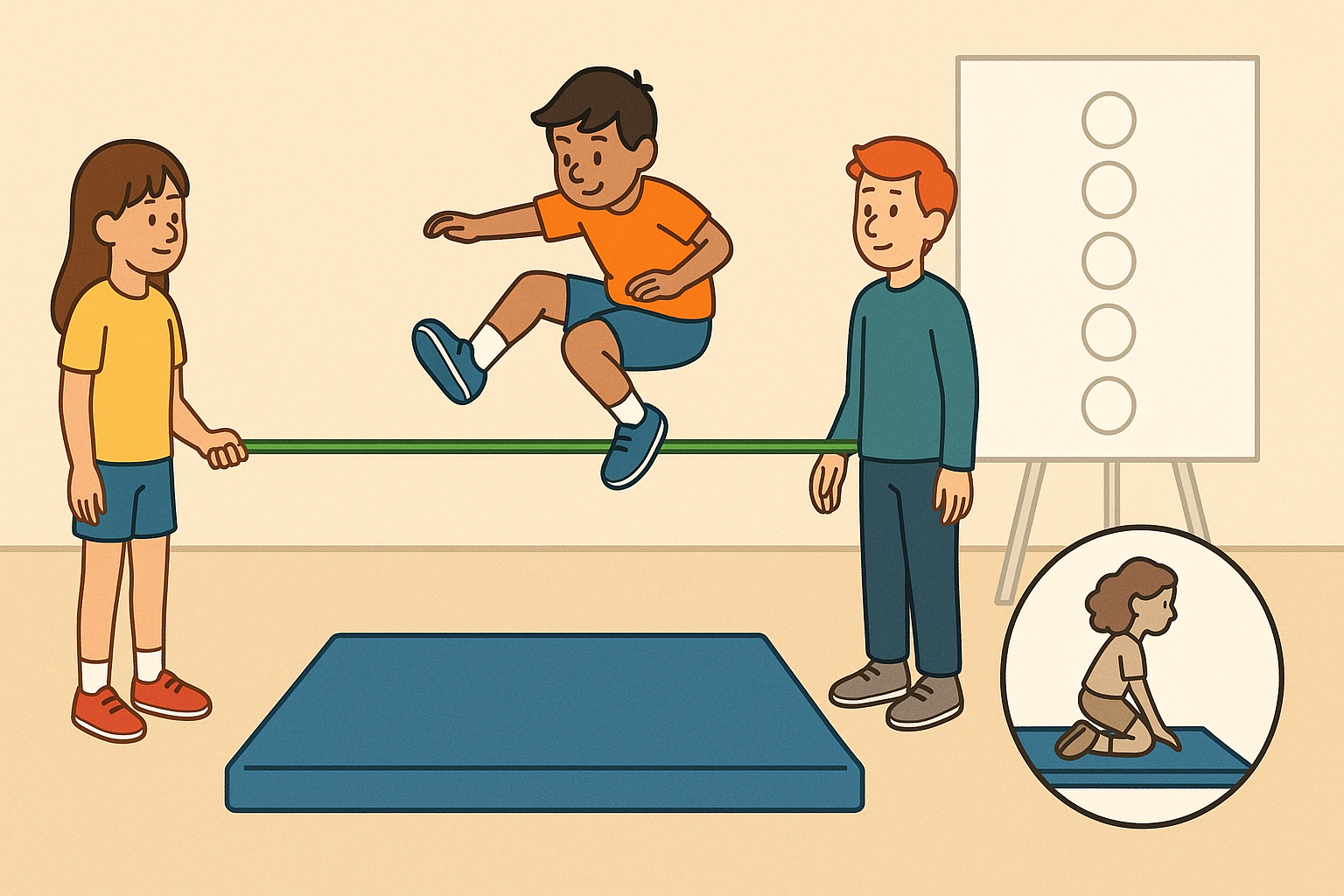 Amb una preparació mínima, matalassos col·locats a la zona de caiguda i un espai segur (pista, pati o gimnàs), el salt d’alçada amb elàstic es converteix en una activitat atractiva per a sessions curtes o com a part d’un circuit d’habilitats.