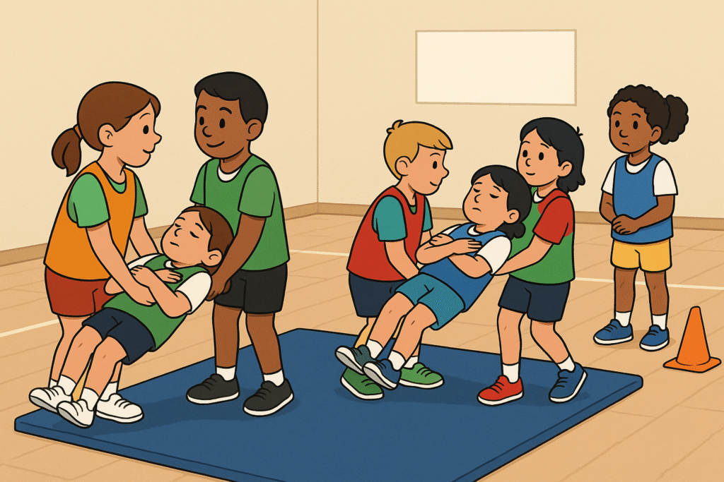 La sessió dels transports cooperatius a educació física s’organitza en quatre estacions per les quals tots els grups canvien cada 6–8 minuts. L’objectiu és coordinar agafades estables, passes controlades i comunicació prèvia abans d’iniciar cada trasllat. El docent equilibra els grups per pes i confiança, delimita recorreguts de 5 a 15 metres sobre un terra no relliscós i marca un senyal sonor per als canvis.