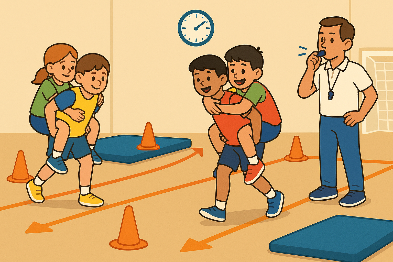 La sessió dels transports cooperatius a educació física s’organitza en quatre estacions per les quals tots els grups canvien cada 6–8 minuts. L’objectiu és coordinar agafades estables, passes controlades i comunicació prèvia abans d’iniciar cada trasllat. El docent equilibra els grups per pes i confiança, delimita recorreguts de 5 a 15 metres sobre un terra no relliscós i marca un senyal sonor per als canvis.