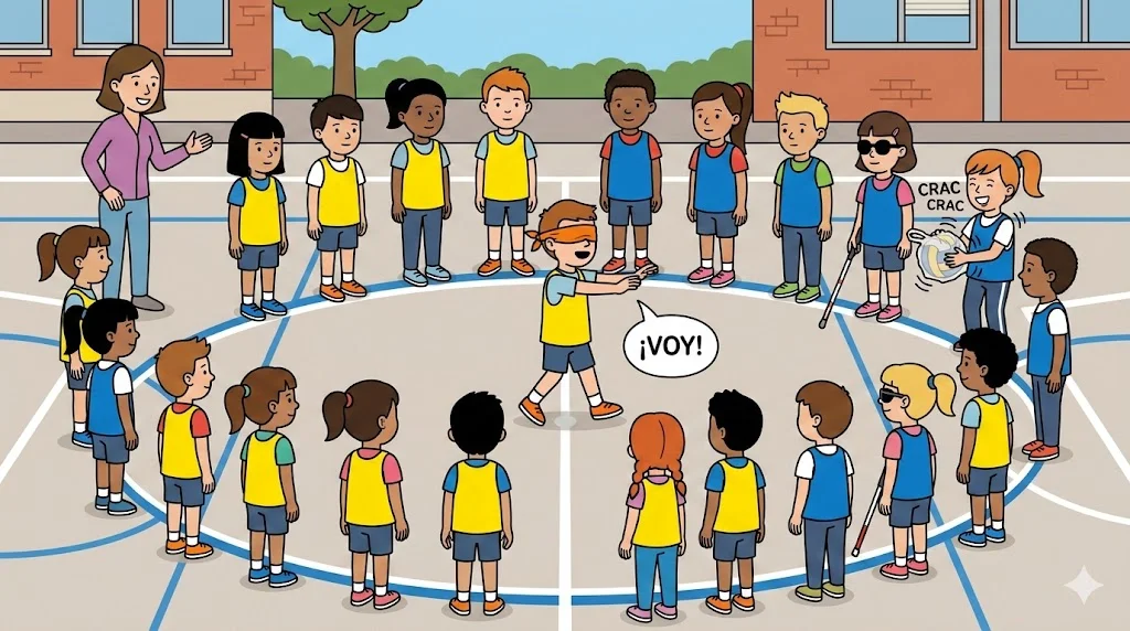 La ubicació en cercle és una activitat motriu de privació sensorial centrada en el processament espacial i l’esquema corporal, ideal per al segon i tercer cicle de primària. En anul·lar temporalment el canal visual, obliguem l’alumnat a reconfigurar les estratègies d’orientació, basant-se exclusivament en el mapatge auditiu i la propiocepció per moure’s per l’espai del gimnàs.