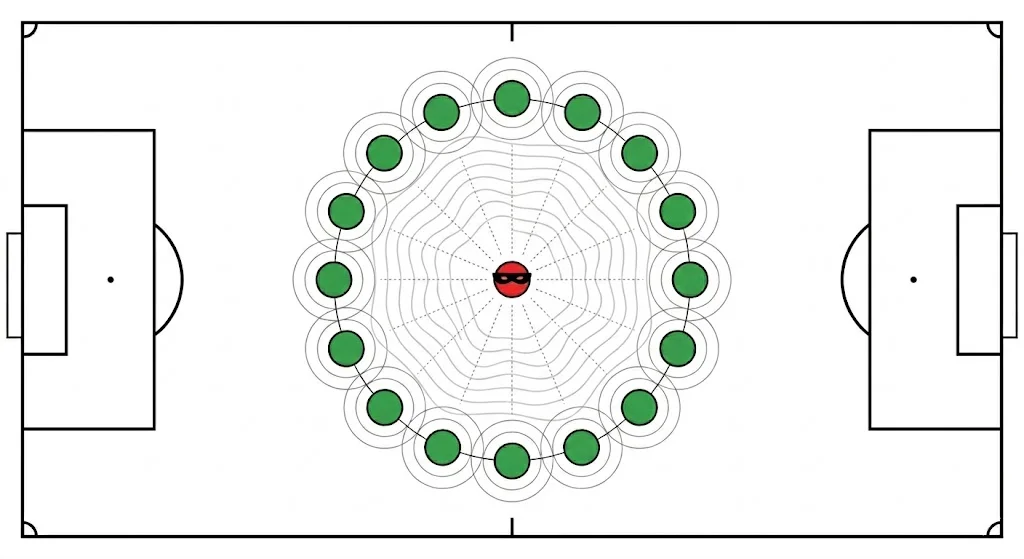 L’alumnat es disposa dret formant un cercle geomètricament uniforme i immòbil a la pista esportiva, mantenint una separació estricta d’un braç de distància entre cadascú per establir un perímetre segur, mentre que un sol alumne amb els ulls embenats se situa al centre exacte de la formació a l’espera de l’estímul sonor.